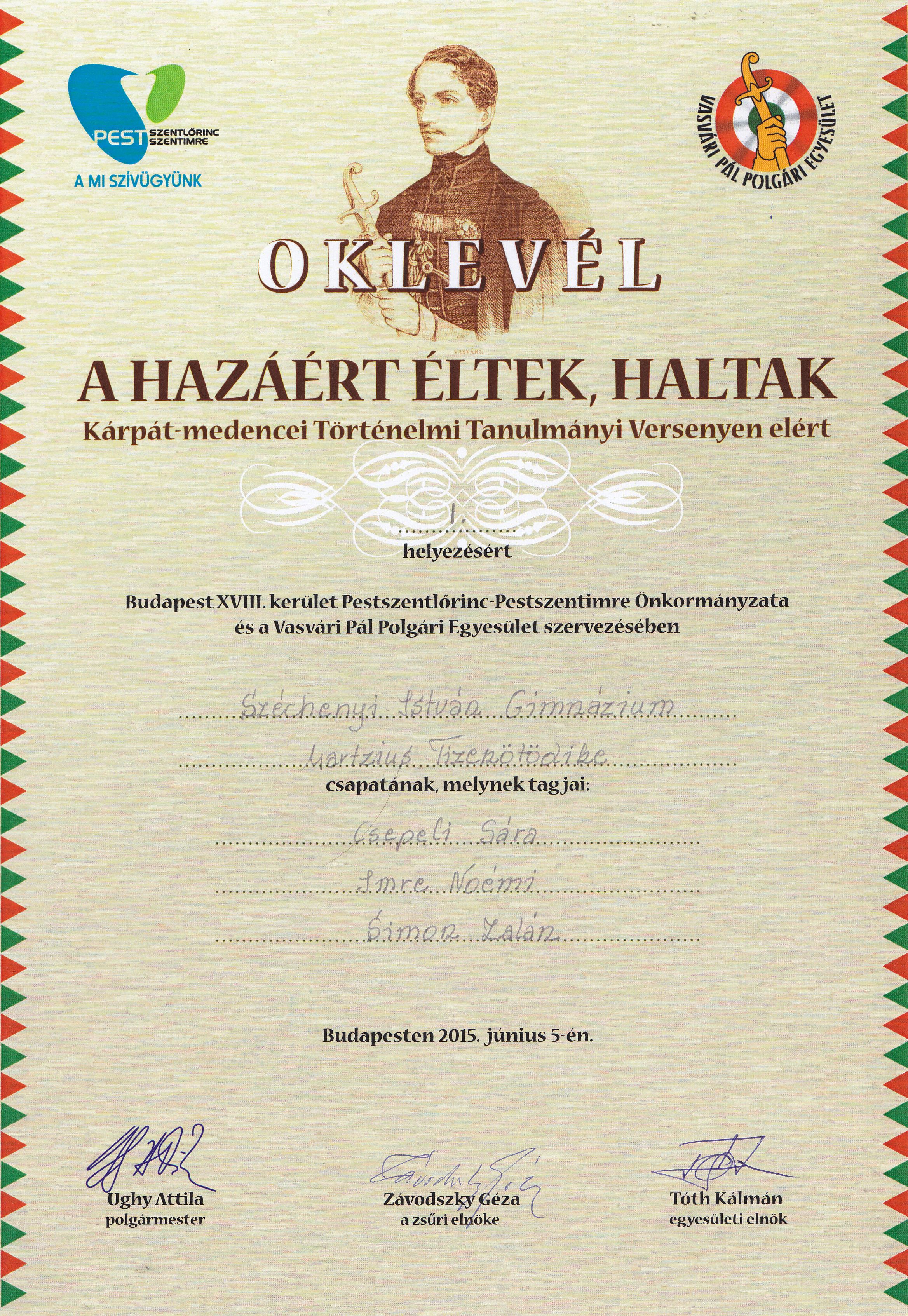 ,,A hazáért éltek, haltak” Kárpát-medencei Történelmi Tanulmányi Verseny döntőjébe jutott a Dunaújvárosi Széchenyi István Gimnázium három 10. A osztályos tanulói: Csepeli Sára, Imre Noémi és Simon Zalán. A budapesti döntőben a csapatok Vasvári Pál életrajzából, az ahhoz kapcsolódó magyar reformkorból, az 1848-49-es forradalom és szabadságharcból, és az első világháború történetéből felkészülve adtak számot tudásukról. A középiskolás kategóriát a három tanuló által alkotott Martzius Tizenötödike nevű csapat nyerte meg. Jutalmuk egy többnapos kirándulás volt a gyönyörű erdélyi Kalotaszegre, ahol ráadásul még a Vasváriról szerzett ismereteiket is tovább bővíthették. F elkészítő tanár: Süveges Zoltán