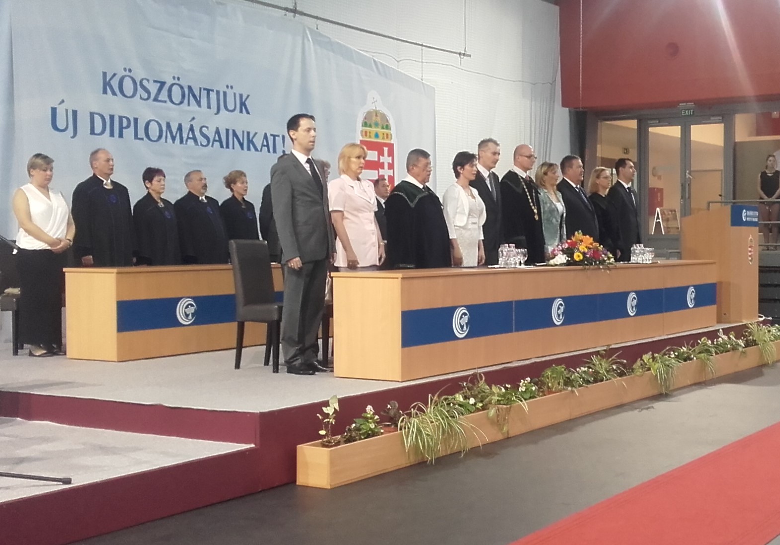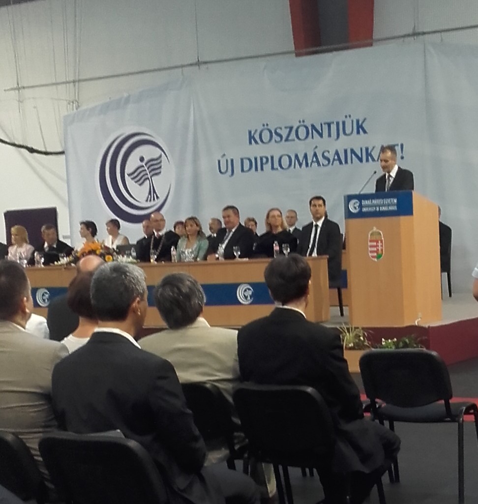 A diplomaosztót megtisztelte jelenlétével dr. Galambos Dénes országgyűlési képviselő is. Hangsúlyozta, hogy egyre fontosabb szerepet tölt be a térség életében a Dunaújvárosi Alkalmazott Tudományok Egyeteme. Kiemelte az innovatív fejlesztések közül az elektromobilitást, amelynek fontosságát Orbán Viktor miniszterelnök is hangsúlyozta dunaújvárosi látogatása során. A Modern Városok Programban fontos szerepet kap az ezt a területet érintő kutató munka a felsőoktatási intézmény falai között.