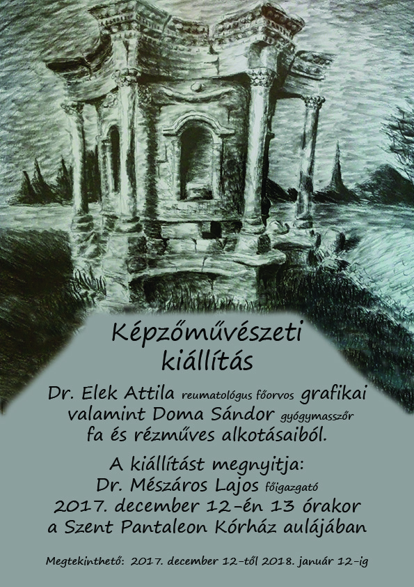 Dr. Elek Attila és Doma Sándor munkatársaink képzőművészeti kiállításának megnyitójára, december 12-én kedden 13 órakor kerül sor intézményünk aulájában, melyre szeretettel várom a sajtó munkatársait.