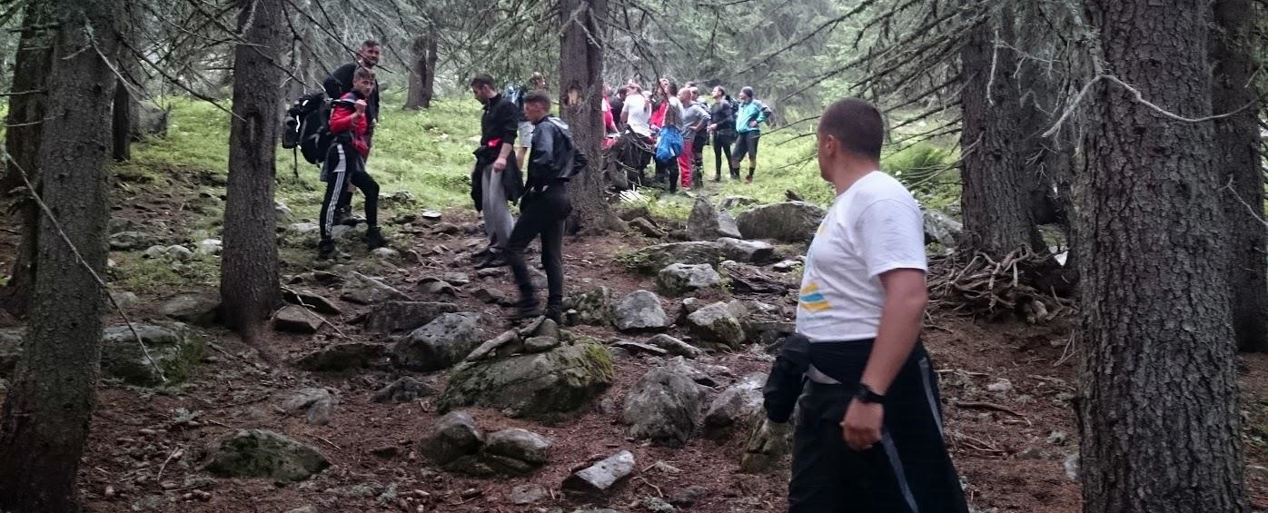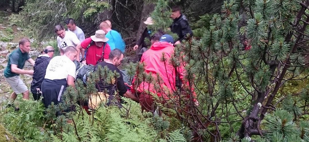 - A mentés legvégére három, 6-6-6 személyből álló csoport verbuválódott össze. A folyamat alatt a sérült lány leszállítása maximális odafigyelést igényelt, hiszen vigyázni kellett a targa (hordágy) dőlési szögére, hogy a lány feje a lábánál mindvégig magasabban legyen. Menet közben több alkalommal újra kellett őt rögzíteni a hordágyhoz. A mentés alatti feladatokat felosztottuk egymás között. Folyamatosan cseréltünk, hiszen másként nem bírtuk volna a terhelést. Így volt, amikor a sérült lány hátizsákját vittük, az utat takarítottuk meg az útban lévő kődaraboktól csakúgy, mint a behajló fenyőágaktól, hogy az valamennyire járható legyen, de a veszélyesebb, csúszósabb szakaszokon egymást is meg kellett tartanunk. Voltak bizonyos szakaszok, ahol 10 -15 métert kézről kézre adtuk a targát, és a hátsók szaladtak előre, hogy végtelenné tegyék az átvevést. Az utolsó szakaszon, a patak fölötti szűk függőhídon két hegyimentő vitte a lányt - mert másként nem lehetett elférni –, amikor a hátul lévő megcsúszott, elesett, miközben csakis arra figyelt, hogy mindvégig helyesen tartsa a hordágyat. Nem érdekelte, hogy saját magával mi lesz, pedig könnyen a sebes patakba is eshetett volna. Végül leértünk. A hegyimentők szerint elképesztő volt az idő, hiszen a mentést 3 óra 45 perc alatt hajtottuk végre.