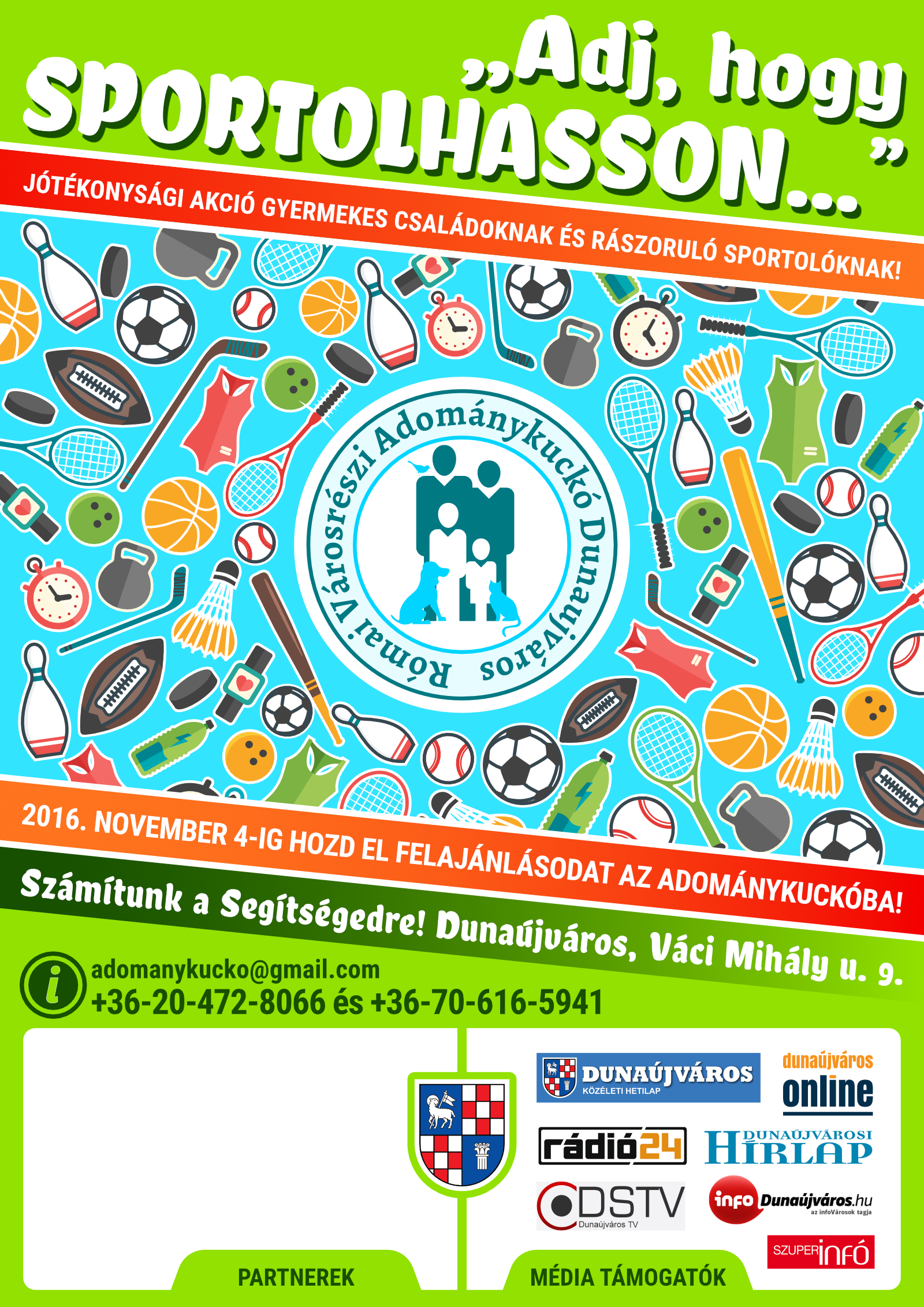 Az akciónk hívószava „Adj, hogy SPORTOLHASSON…”, ezzel is bátorítva a sportegyesületeket, magánszemélyeket, sportáruházakat, kereskedelmi cégeket, hogy álljanak a jó ügy mellé és támogassák törekvéseinket és a rászoruló gyerekeket, családokat, hogy a használható sporteszközökkel, ruházatokkal közösen segítsük Őket.