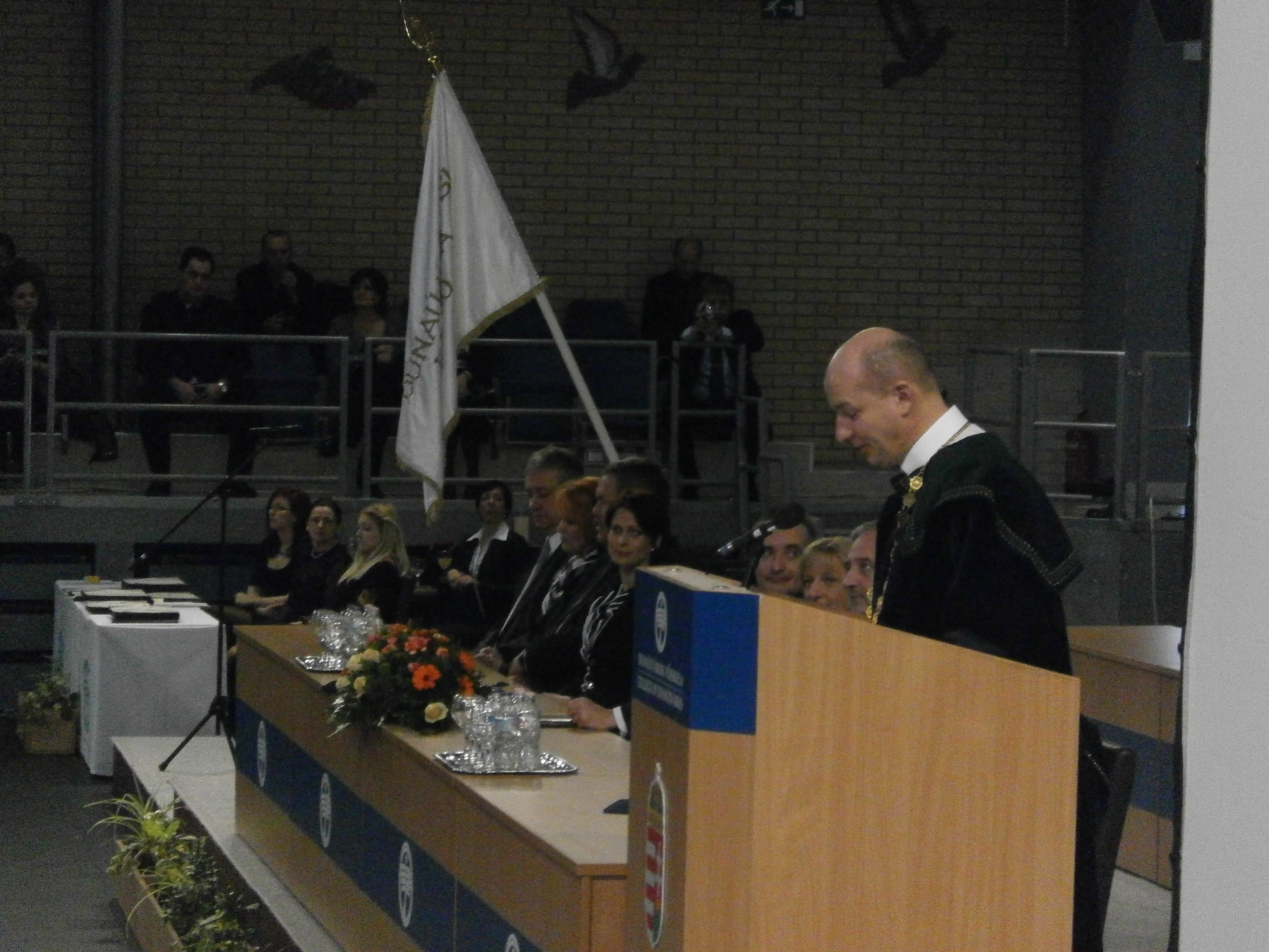 A Himnusz eléneklése után ünnepi műsor vette kezdetét. Dr. Rajcsányi-Molnár Mónika rektor helyettes asszony és Dr. András István külön kihangsúlyozta: az a tény, hogy a diplomások most kirepülnek az alma máterből, nem jelenti azt, hogy nem térhetnek vissza oda. Akár régi diákként, akár másoddiplomai képzésben résztvevőként, akár partnerként továbbra is szívesen látják az ott végzett hallgatókat. Köszönetet mondott rektor és helyettese egyaránt a szülőknek, partnereknek, házastársaknak, akik türelmükkel és megértő támogatásukkal segítették a hallgatókat. A külföldi végzősöket is köszöntötték, természetesen angol nyelven.