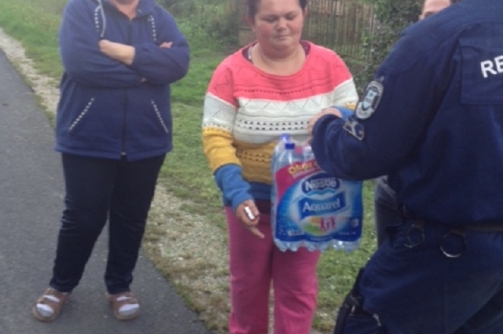 Az árvízi védekezésben és a kitelepítésben segítő rendőrök vizet osztanak a települések lakóinak.