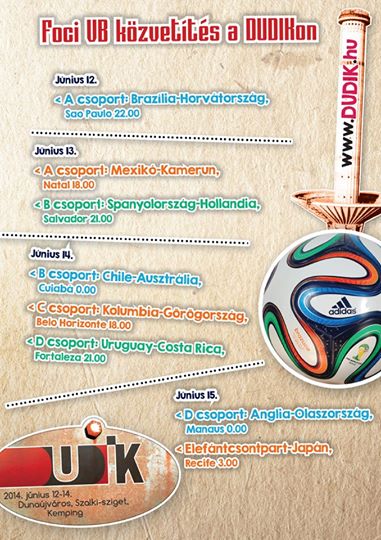 Jó hír a focirajongóknak! Senki sem marad le az idei brazíliai FIFA Labdarúgó Világbajnokság mérkőzéseiről, aki ellátogat a DUDIK-ra, a fesztivál területén ugyanis óriáskivetítőn lesznek követhetőek a vb eseményei. A fesztivál alatt lezajló mérkőzések rendje a következő: