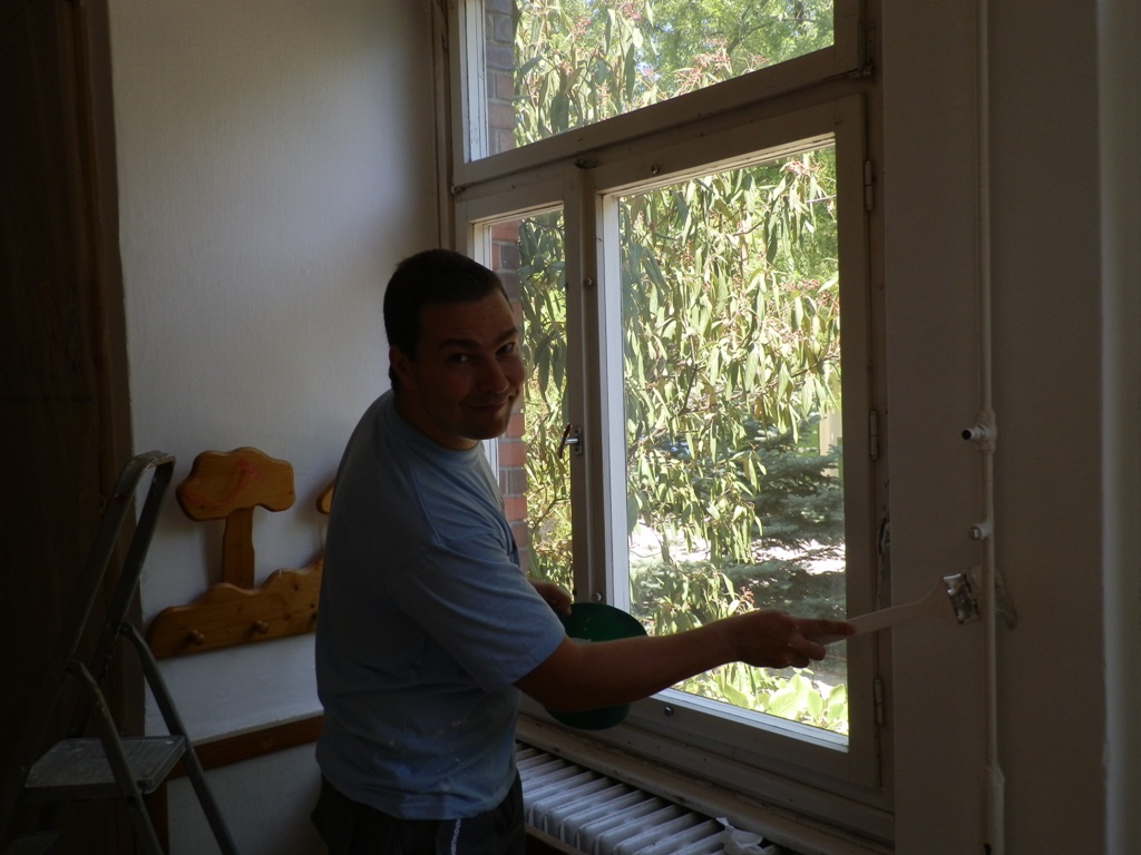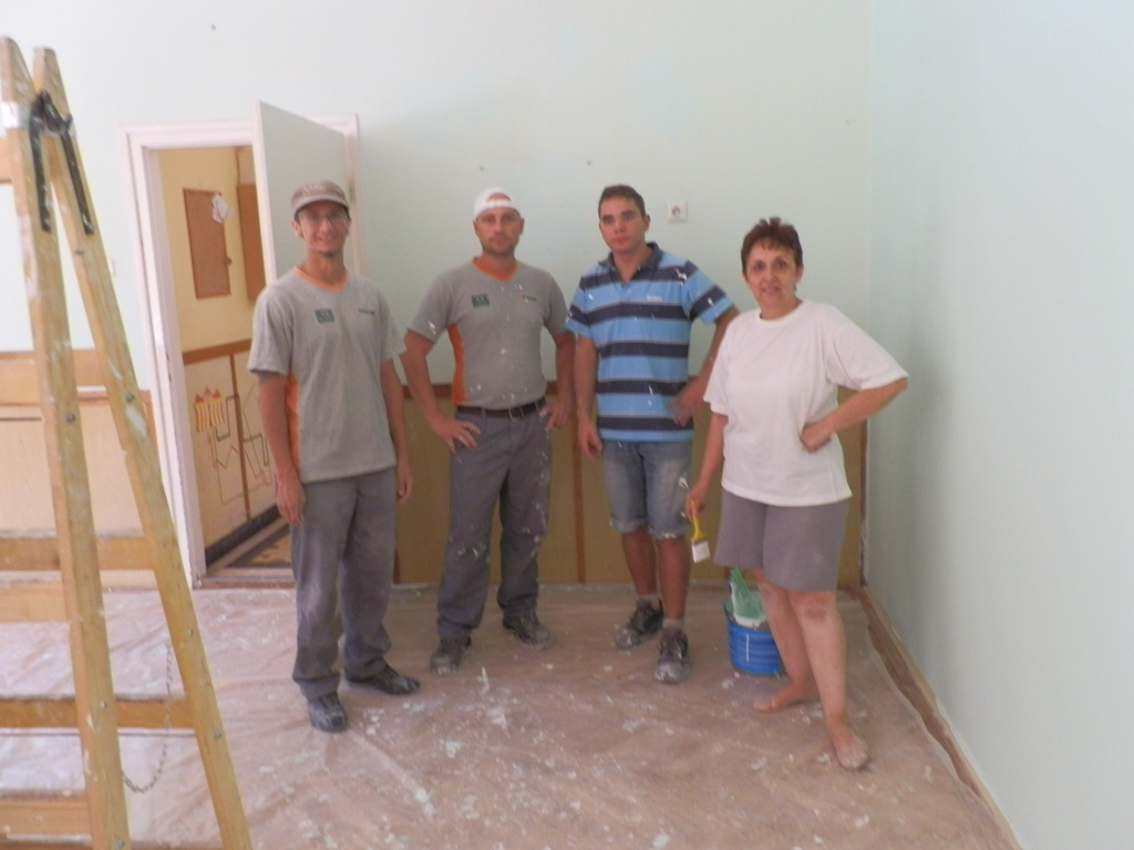 Precízen szakavatottan megy a festés, pedig nem ezzel foglalkoznak, de ahogy mondják, egy magyar férfinak nem okoz gondot ilyen fajta munka elvégzése, hiszen otthon mindegyik fogott már ecsetet a kezébe. A Szivárvány óvoda dolgozói nagyon örülnek a segítségnek. Szörppel, szendviccsel, kávéval látják el a munkásokat, s persze maguk is részt vesznek a felújításban. Az arborétum-kert, a zöld óvoda most már nem csak tartalmában korszerű, gyerekközpontú, hanem a 100 kisgyereket friss tiszta, jó illatú csoportszobák várják szeptembertől.
