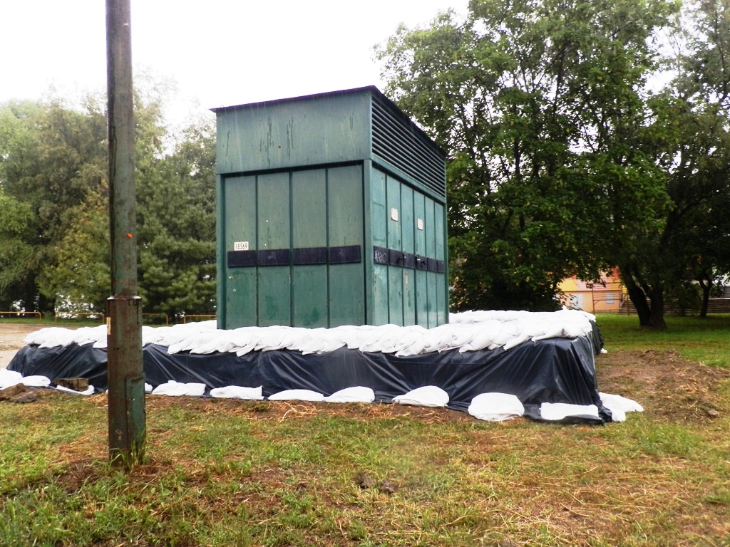 A Halászcsárda még nyitva, de már körbe van zsákolva, a Dunának csak egy lehelet kell, s kilép a medréből, a kemping bejárata is védelemre szorul.