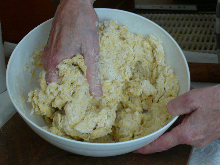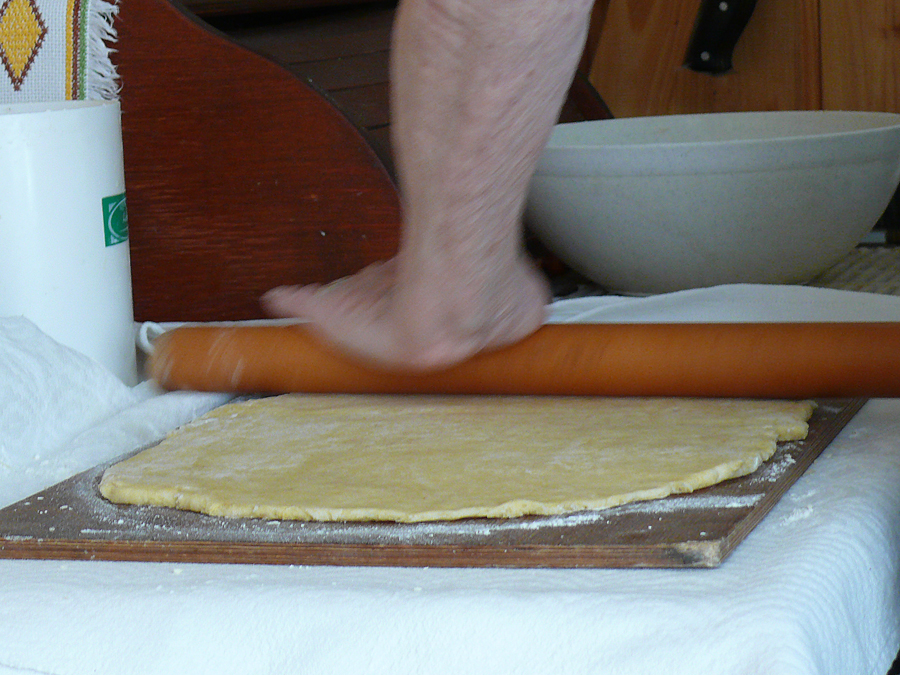 Amikor összegyúrom és keménynek találom a tésztát, egy pici tejföllel tudom még hígítani, de csak végszükség esetén. A zsíros tésztánál fontos, hogy csak addig kell gyúrni, amíg össze nem áll. Ha a kézről könnyen lejön a tészta, akkor már nem kell tovább gyúrni. Majd kettéveszem, hiszen ez a mennyiség is két adaghoz elég