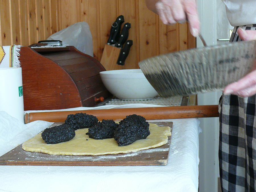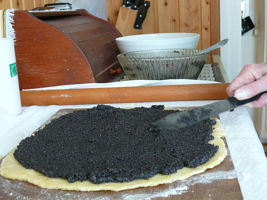 Ezután lisztezett deszkán egyenletesre, körülbelül fél centi vastagra nyújtom ki. Az, hogy milyen nagy legyen, függ a tepsi nagyságától, hiszen a kinyújtott tészta nem lehet nagyobb, mint a sütésre használt tepsi. Ráteszem a mákot úgy öt kupacba, és ezután elkenem egy rugalmas pengéjű késsel. Azért nem jó kanállal vagy kemény pengéjű késsel kenni, mert akkor a mákos massza könnyen ráragad.
