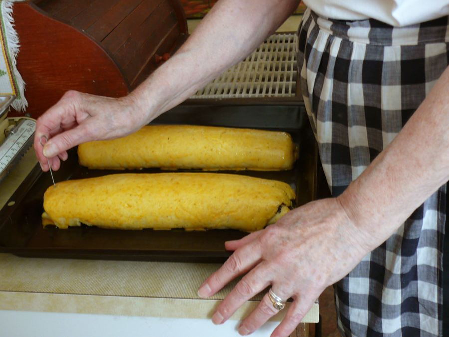 Amikor elkezdem a tekerést, az első hajtást jól rányomom, majd szorosan összetekerem a tésztát. A végét pedig jól lenyomkodom a tekercs végét, hogy ne folyjon ki belőle a mákos massza. A kész tekercset megkenem a tojás sárgájával, amit egy nagyon kevés vízzel hígítok. Majd várok tizenöt percet, hogy egy kicsit megkeljen a tészta. Csak ezután szurkálom meg hústűvel, mert így nem kerül a lyukba a tojássárgája, és nem zárja el a távozó gőz útját.