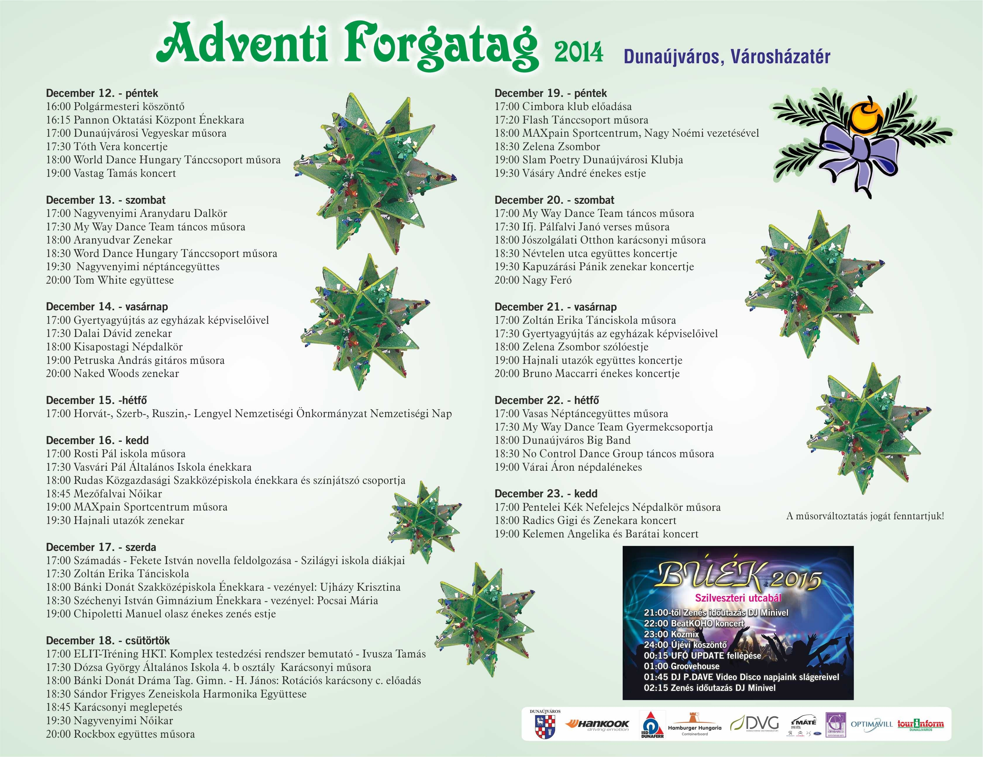 A színpadon helyi fellépők és hazai sztárok, a pavilonokban forralt bor, tea, kürtös kalács, kézműves termékek várják az érdeklődőket. Az új C-szárnyban a gyermekek játszóházban készíthettek adventi dekorációt. A körítés pedig csillogó fények, szán, rénszarvas, és persze csillogó fényfüzérek.