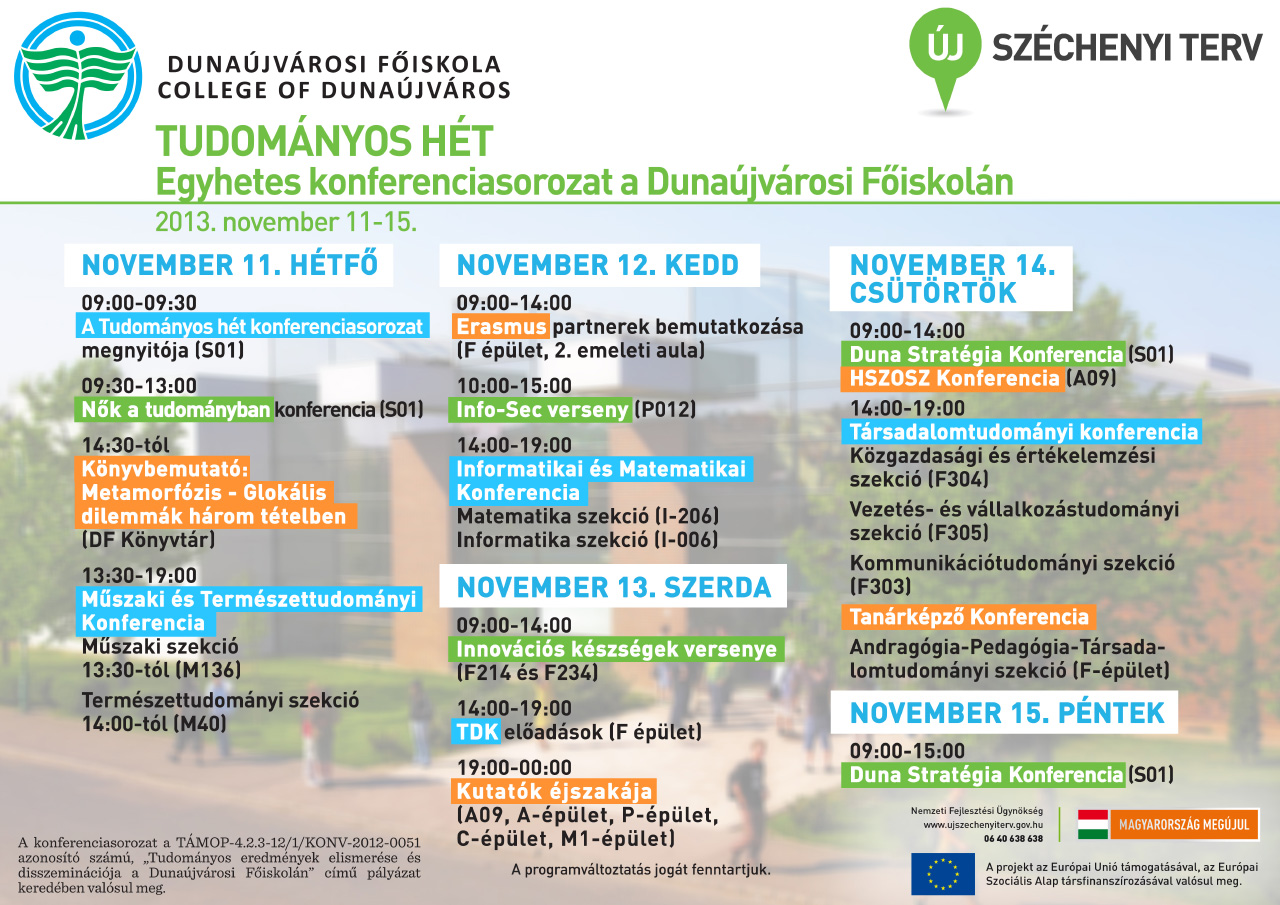 November 11. és 15. között rendezik meg a nagy népszerűségnek örvendő Tudomány Hete sorozat folytatását a Dunaújvárosi Főiskolán.