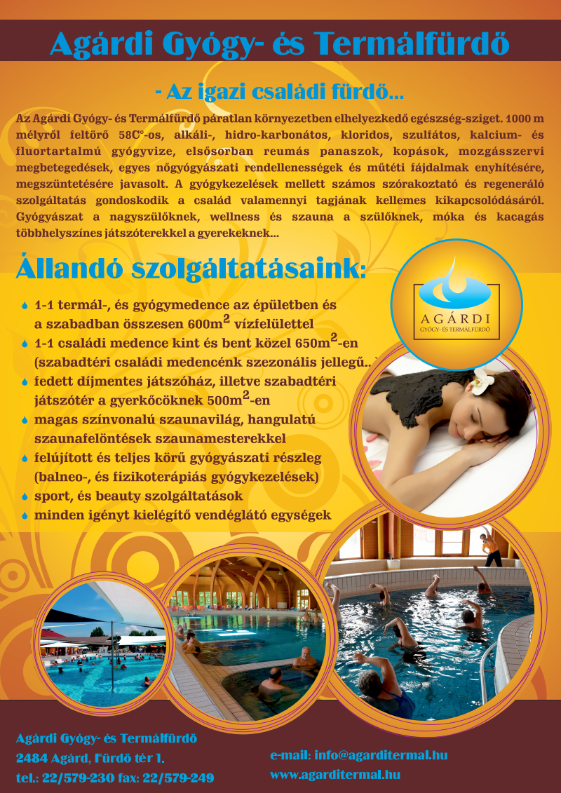 2014. szeptember 1-jétől ismét Fejér megye nyugdíjasainak szeretne kedvezni az Agárdi Gyógy-, és Termálfürdő azzal, hogy a fürdő regeneráló, TB által finanszírozott gyógykezeléseit kedvezményes áron és megújult környezetben nyújtja a nyugdíjasok számára (balneoterápiás részleg 08.09-08.31. között teljes felújításra kerül, mely során korszerűbb és barátságosabb helyiségeket alakítanak ki).