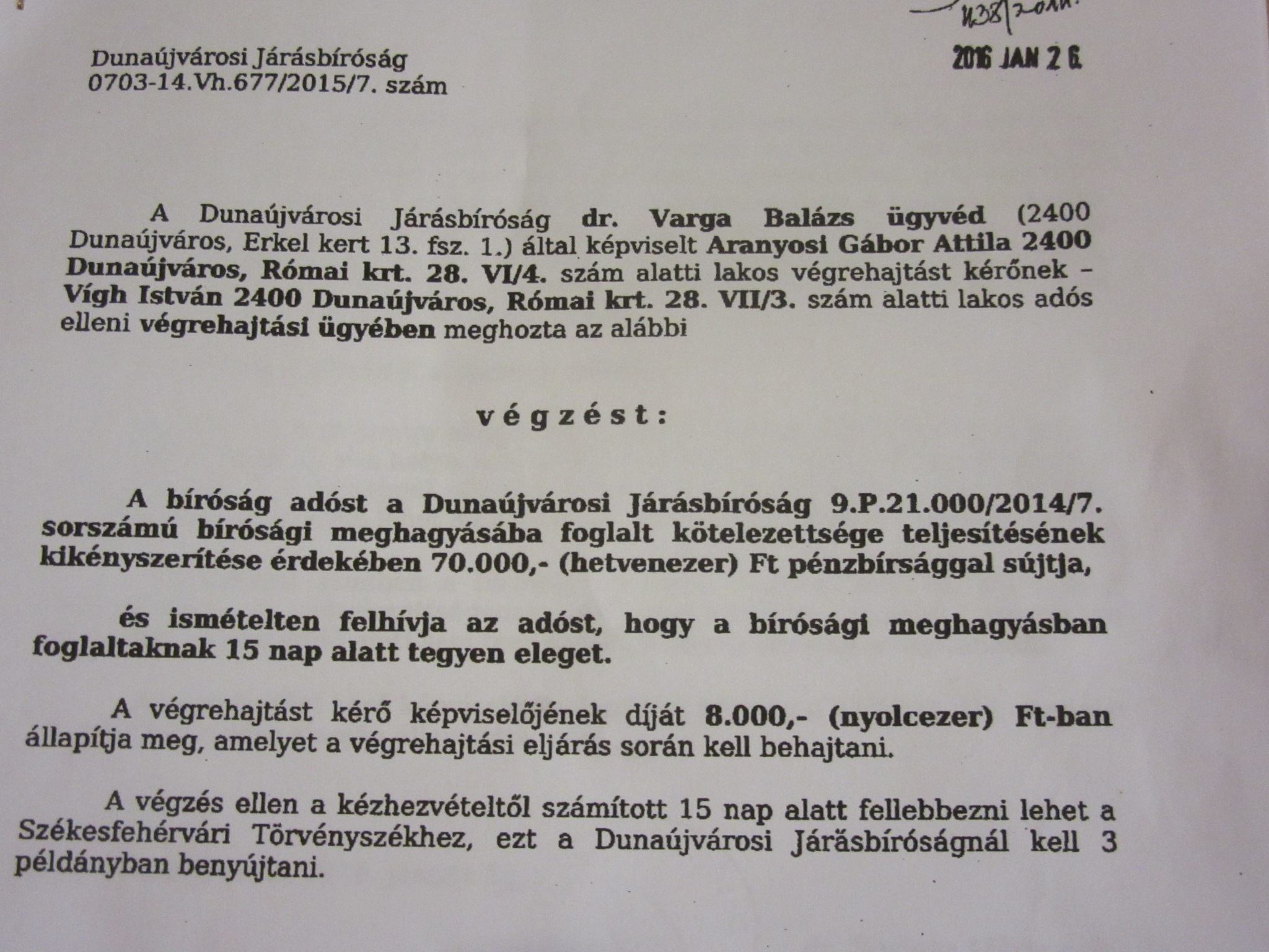 Időközben a bíróság is megállapította, hogy nem szép dolog, ami a lakásban történik, s felszólította Vígh urat, hogy tüntesse el a dobozait. Ez persze nem történt meg. Ekkor megbüntette 70000 forintra, majd ennek behajtását átadta végrehajtónak.