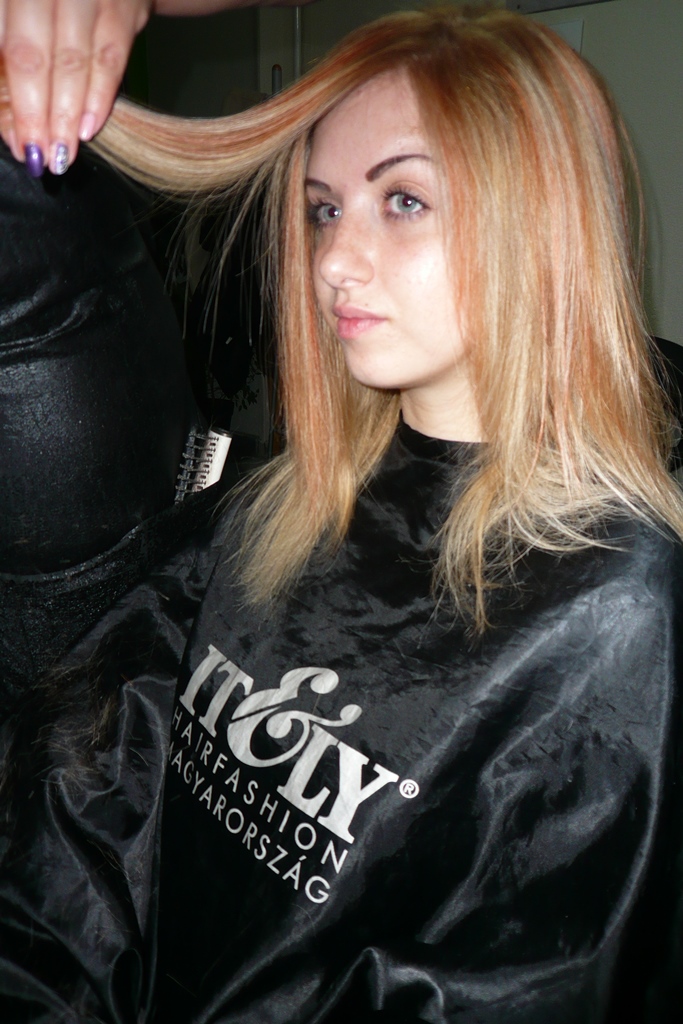 Először is a haja szőke színe változott, a kopott szőke helyett mediterrán szőke lett, s belefestettek rézvörös tincseket, amelyek kellemesebb, izgalmasabb, de lágyabb árnyalatot adtak a 20 éves tanuló lány fehér bőrének. Mi közben vártuk az eredményt megtudtuk, hogy a bolti festékekkel jobbára csak színezni lehet, az enyhébb hatékonyságú (otthon is biztonsággal használható) vegyi anyag tartalma miatt jelentős árnyalatkülönbségeket nem lehet velük elérni, ehhez a fodrászfestékek kellenek, de abban is nagy a minőségi különbség. Egyszerre végezték, úgynevezett körbefestéssel a kétféle hajszín festését, így egy beavatkozással meg tudták oldani a haj átfestését.
