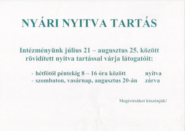 A Munkásművelődési Központ nyári nyitva tartása 2014. július 21.-től az alábbiak szerint módosul: