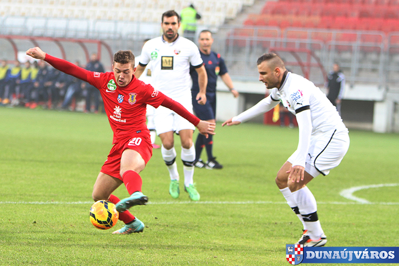 Farkas szabálytalansága után a vendégeké volt az első veszélyes támadás, amikor a pontrúgást követően Causic fejelt tiszta helyzetből a 11-es pontról mellé. Ezt követően azonban ritmust, és játékstílust is váltott csapatunk, akik sorban alakították ki a lehetőségeiket. Jól védekezett, és sokszor blokkolt a vendégek védelme több alkalommal, így Zsótér és Orosz lövésénél is. A Dunaújváros agresszív letámadó játékkal szerzett ellenfele térfelén többször labdát, így odaszögezve kapuja előterébe a pécsi csapatot. Poleksicnek a 11. percben kellett először közbeavatkoznia, amikor Orosz sarokrúgását öklözte ki szép mozdulattal. Egy perccel később Petneházi szabadrúgása Zsótért találta meg, de Donát fejese elkerülte a kaput. Újabb egy perc elteltével szépségdíjas akciót indított útjára Villám, Oroszt ugratta ki, aki az alapvonalról gurított vissza Nikházihoz, de a lövés elakadt a védőkön. Az első negyedóra egyértelmű hazai fölénye a továbbiakban is folytatódott. Nikházi tért ölelő pontos passzát Villám bombázta kapura, de a labda keresztben elcsúszott Poleksic előtt.