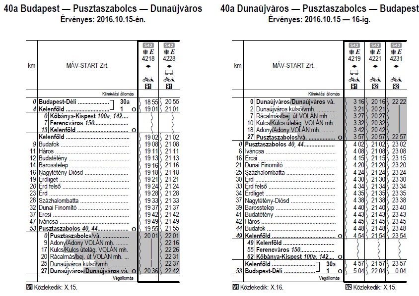 A MÁV-START Zrt. tájékoztatása szerint 2016. október 15-től 2016. október 16-ig Pusztaszabolcs – Dunaújváros vasútvonalon végzett pályakarbantartási munkák miatt a mellékletben csatolt vonatok módosított menetrend szerint közlekednek, illetve Pusztaszabolcs – Dunaújváros állomások között vonatpótló autóbuszok közlekednek a sötétített alappal jelölt menetrend szerint.