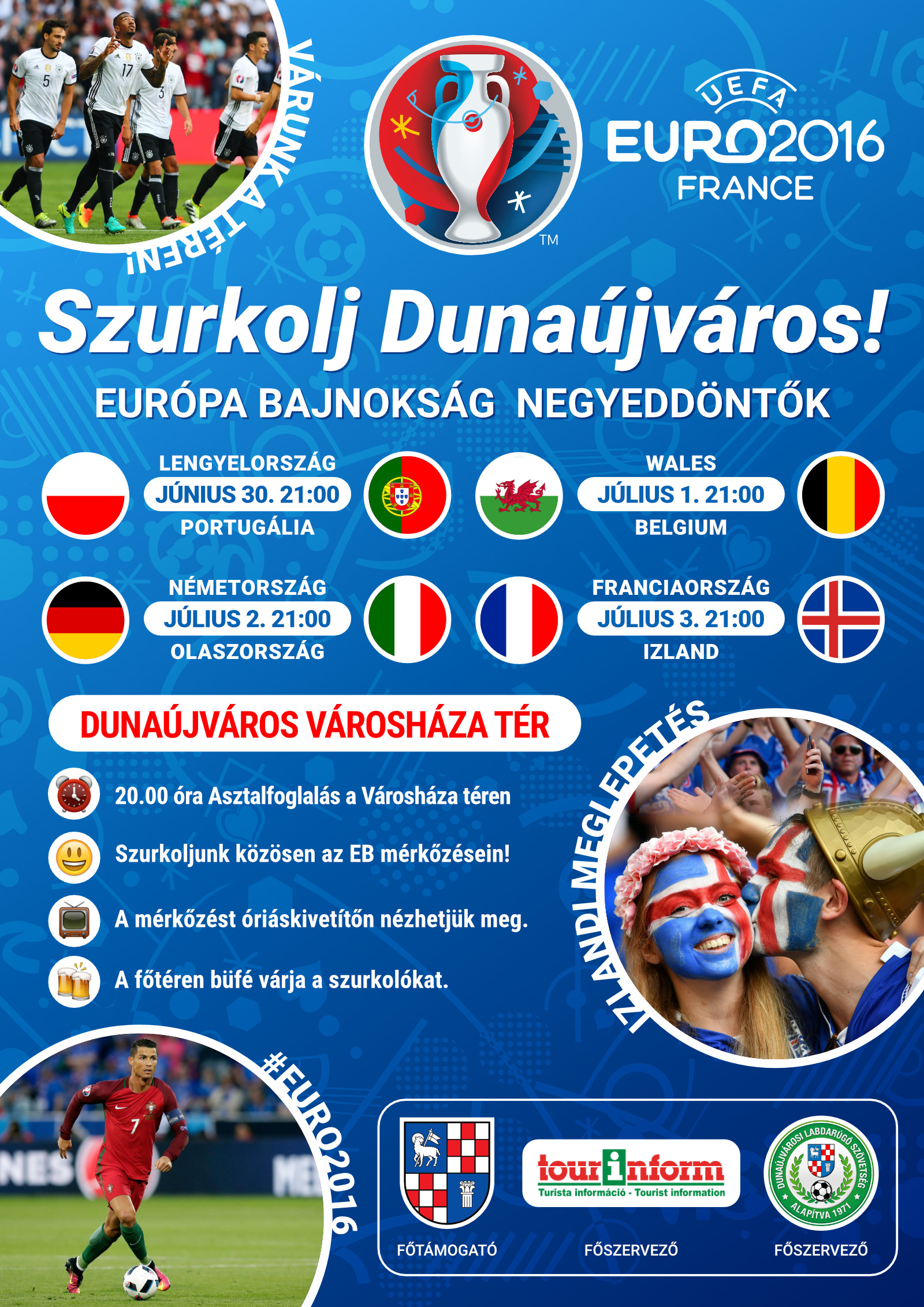 Július 1-jén, pénteken 21:00-tól a Wales-Belgium, július 2-án, 21:00-tól a Németország-Olaszország, július 3.-án, vasárnap pedig a Franciaország-Izland mérkőzéseket tekinthetik meg a szurkolók szintén 21:00-tól a Városháza téri kivetítőn. Asztalfoglalás mind a három napon 20:00-tól.