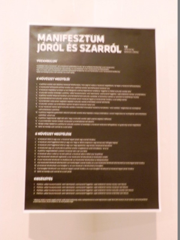 Aztán rátért egy manifesztumra, s hosszasan elemezte a szöveget. Sem a manifesztum nem volt rövid, sem a magyarázat. A hatalom és művészet kapcsolatát boncolgatta a szerző, Borsos Lőrinc.