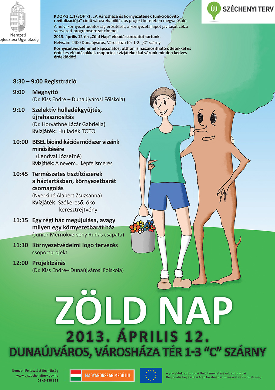 - Már két programsorozat pályázata lezárult, s ennek eredményeképpen április 12-én Zöld nap lesz, amelyen a környezettudatossággal és a környezetvédelemmel kapcsolatos előadások hangzanak el a C-szárnyban, és mindezeket játékos tudásalapú