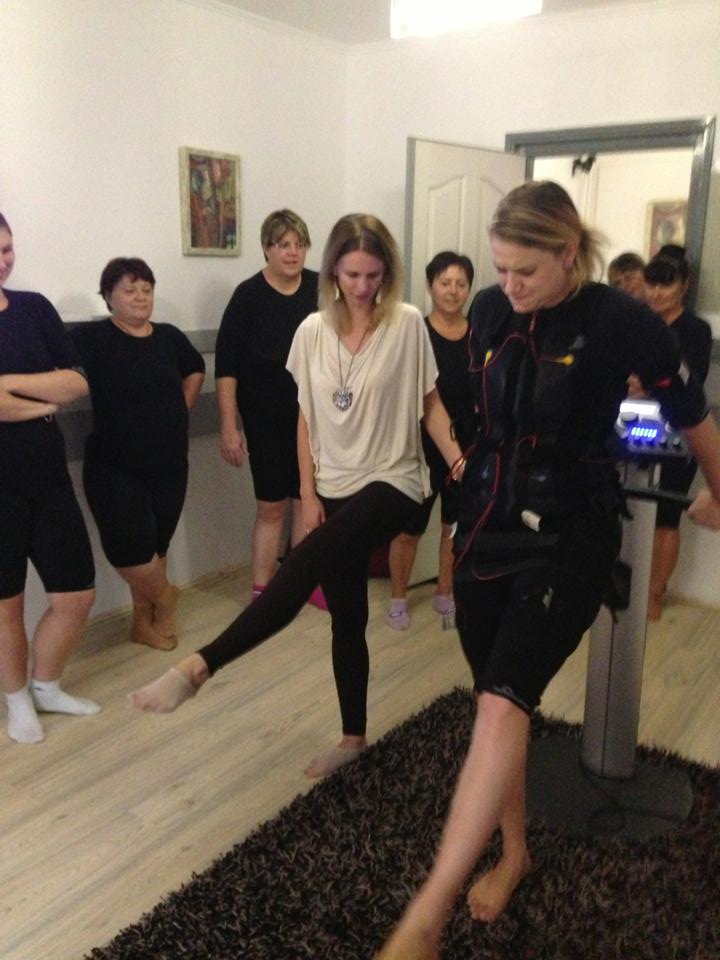 Érkezéskor még kicsit izgatottak voltunk. A rendkívül udvarias, kedves fogadtatás gyorsan oldotta a gátlásainkat. Az edzőnő elmondta, mi is fog velünk történni. Mindannyian kaptunk egy elasztikus, vékony fekete pamut térdnadrágot és egy ugyanilyen pólót. Hitetlenkedve méregettük, mert borzasztó kicsinek tűntek, de csodák csodája, fel tudtuk húzni magunkra. Kifejezetten élveztem az öltözéket, mert több számmal karcsúbbnak látszottam benne. Volt egy bátor jelentkező, aki elsőként vállalta, hogy felveszi a mellényt, aminek a hasán és a hátán elektródák voltak. Kapott még 1-1 övet a karjaira, combjaira, és egy nagyobbat a csípőjére, fenekére. Mielőtt felvette volna, az öveket és a mellényt a belső felén lespriccelték vízzel, hogy jobban vezesse az áramot. Csatlakoztatták az öltözék érintkezőit, és elkezdődött az edzés. A speed-fitness lényege, hogy az izmok hatékonyabb munkát tudnak végezni, így kevesebb idő alatt éri el az ember az izmok erősödését, a súlycsökkenést. Ráadásul a bőrnek is jót tesz, feszesít, nem ereszkedik meg nagyobb súlyleadásnál. Cukkoltuk egymást, hogy úgy nézünk ki, mint a bevetésre induló kommandósok. Sokat nevettünk, csapatépítő tréningnek is felfoghatjuk a délutánt.