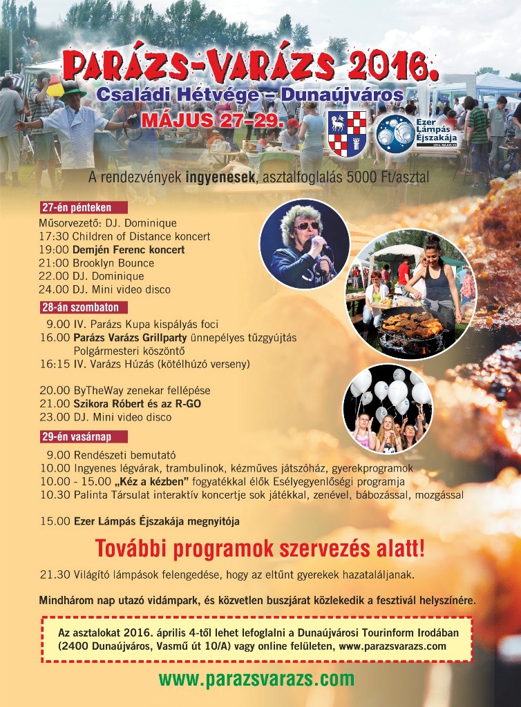 Szombaton kerül sor az össznépi sütgetésre, a Parázs Varázsra. Délelőtt sportprogramok, kispályás foci és sárkányhajó kupa lesz. 14 órára felállítják a több mint háromszáz asztalt. Ekkortól lehet elfoglalni a csapatoknak az előzetesen megváltott helyeiket. A Parázs Varázs területére 14:00 és 15:30 között lehet behajtani az autókkal, a pakolás után pedig a kijelölt parkolóhelyekre kell állni (a rendezvény végén 23 és 24 óra között lehet ismételten behajtani). A regisztrációkor kapott transzakciós kóddal lehet majd átvenni a CIB sátornál az asztalonként járó egy zsák faszenet, egy csomag jeget és a 0,75 kg-os Dunaújváros kenyeret.