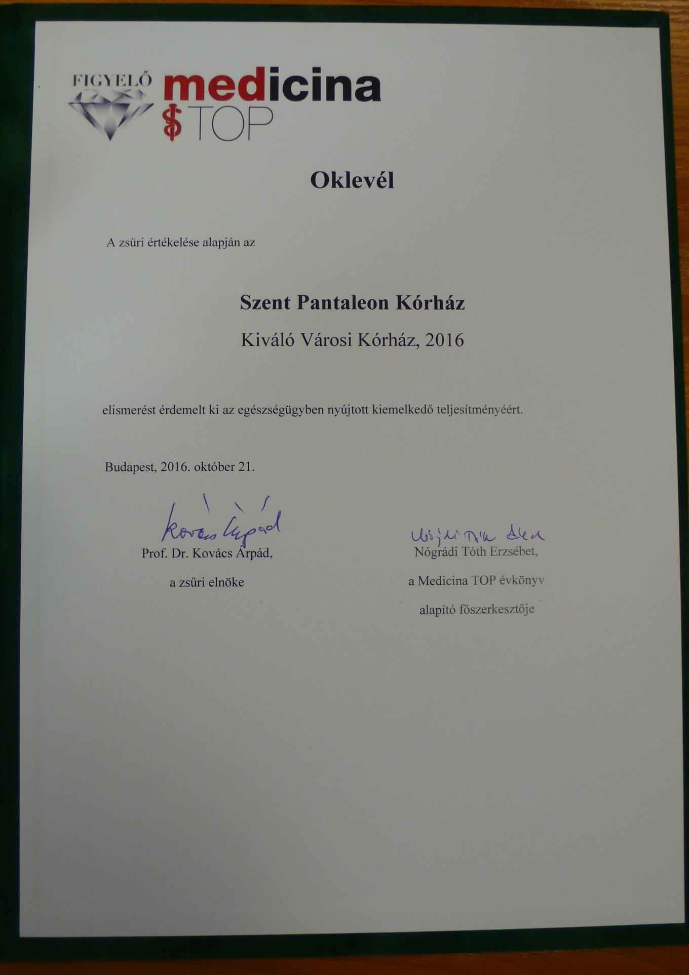 Az elmúlt évek munkájának gyümölcs érett be azzal, hogy Kiváló Városi Kórház díjat nyert a Dunaújvárosi Szent Pantaleon Kórház, amely egyben a Semmelweis Egyetem gyakorlókórháza. A városi kórházak között nagy ágyszámmal, sok profillal működik az intézmény, s jellemzően a nem kis feladattal járó, nehéz szociális körülmények között élő lakosságot látja el. A kórház gyógyító szakmai színvonala egyenletesen jó, a szolgáltatások minősége figyelemre méltó, valamint kiemelkedően fejlett és színvonalas az infrastruktúrája.
