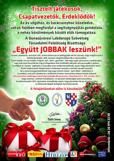 Az év végéhez, és karácsonyhoz közeledve, sokak fejében megfordul a segítségnyújtás gondolata, a nehéz körülmények között élők támogatása. A Dunaújvárosi Labdarúgó Szövetség Társadalmi Felelősség Bizottsága „Együtt JOBBAK leszünk!" címmel ruhanemű, műszaki cikk, tartós élelmiszer és játékgyűjtő akciót szervez, hogy megkönnyítse mindazok dolgát, akik szívesen megajándékoznák a rászorulókat.