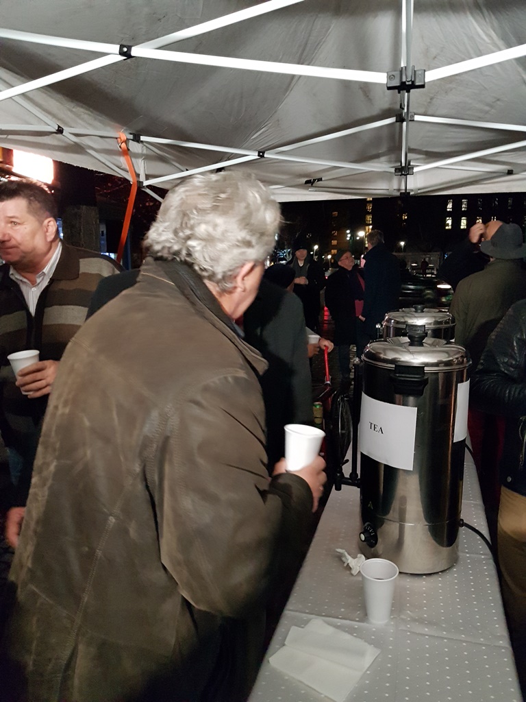 Az országgyűlési képviselő, a polgármester, az alpolgármester áll a teás és a forralt boros kannál mögé, hogy jótékony cél érdekében kiszolgálják a vendégeket.