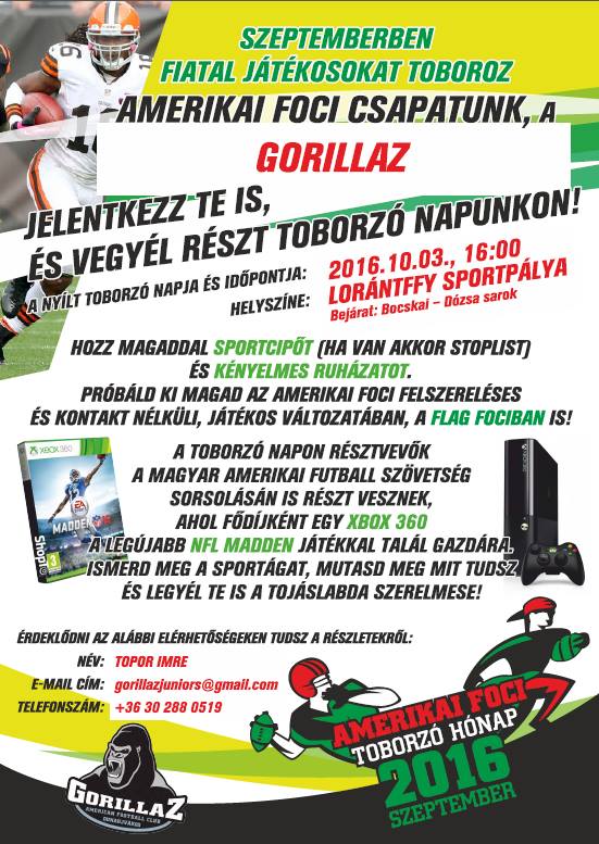 A szeptember a toborzás időszaka, így ebben a hónapban Amerikai Futball csapatunk is nagy hangsúlyt fektet új tagok toborzására. Már 8 éves kortól lehet csatlakozni a Gorillákhoz.
