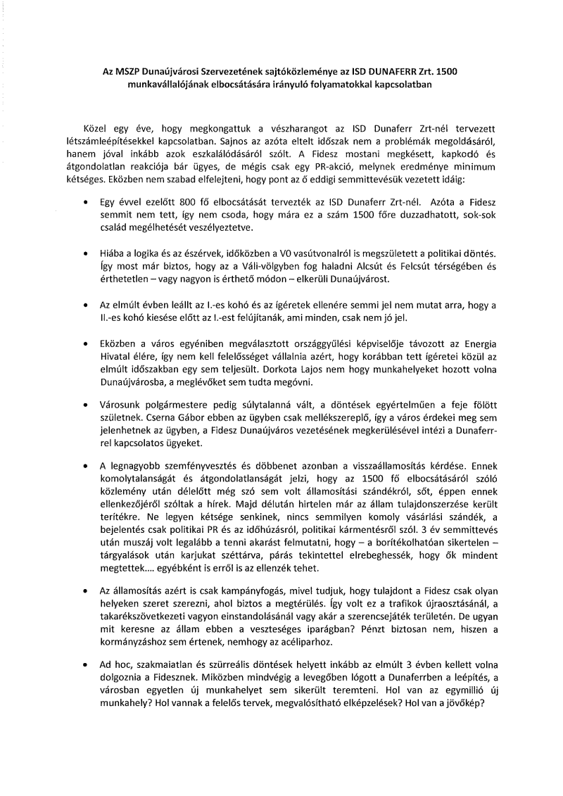Az MSZP Dunaújvárosi Szervezetének sajtóközleménye az ISD DUNAFERR Zrt. 1500 munkavállalójának elbocsátására irányuló folyamatokkal kapcsolatban