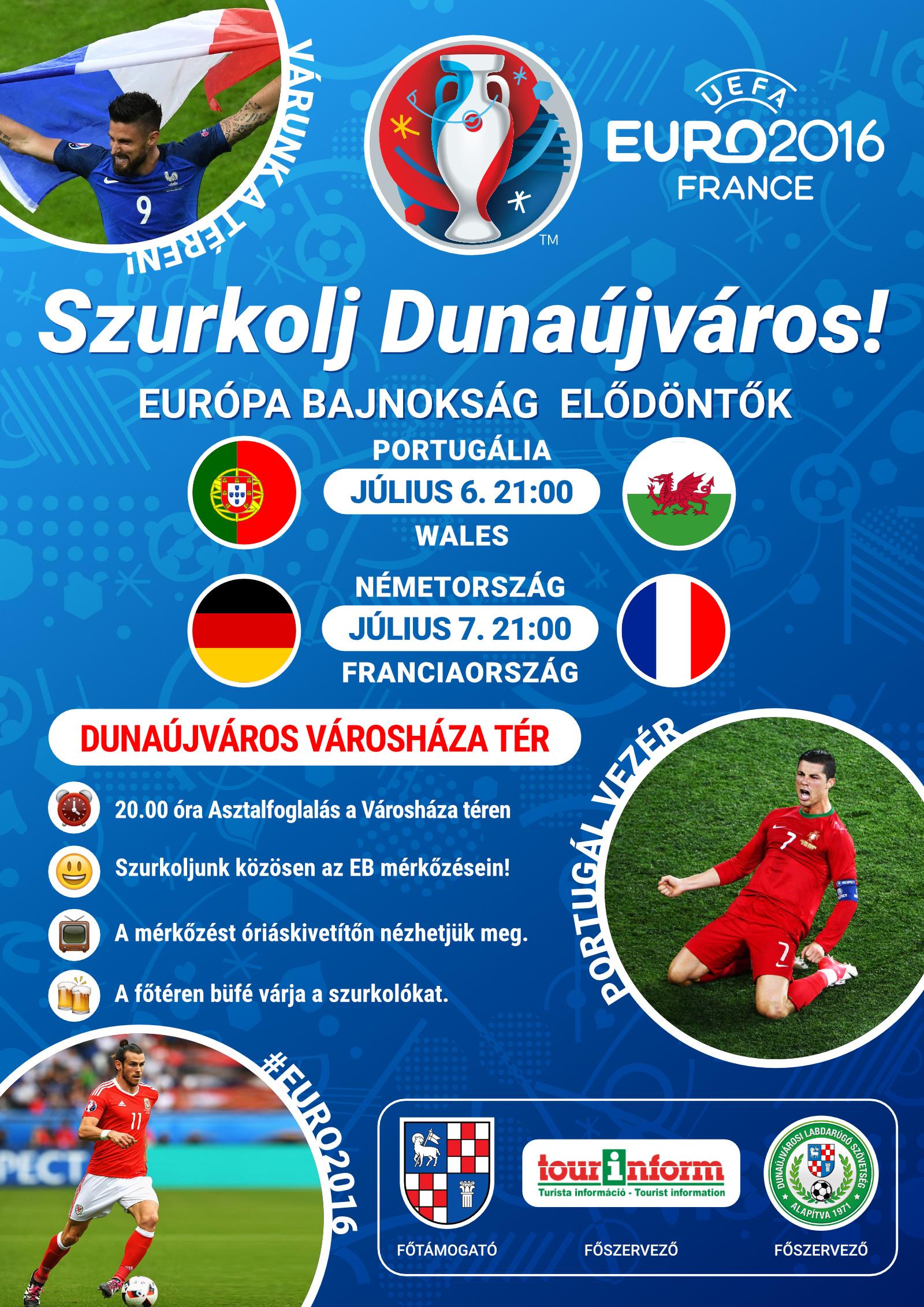 Ma 21 órától a Portugália - Wales mérkőzést, holnap, szintén 21 órától pedig a Németország - Franciaország összecsapást követhetjük óriáskivetítőn a Városháza téren, ahol büfé is várja a szurkolni vágyókat. Asztalt 20 órától lehet foglalni.