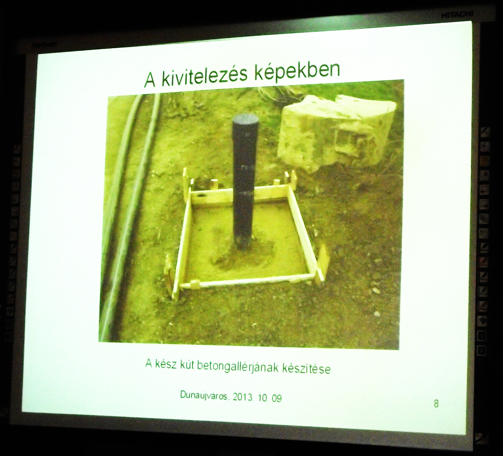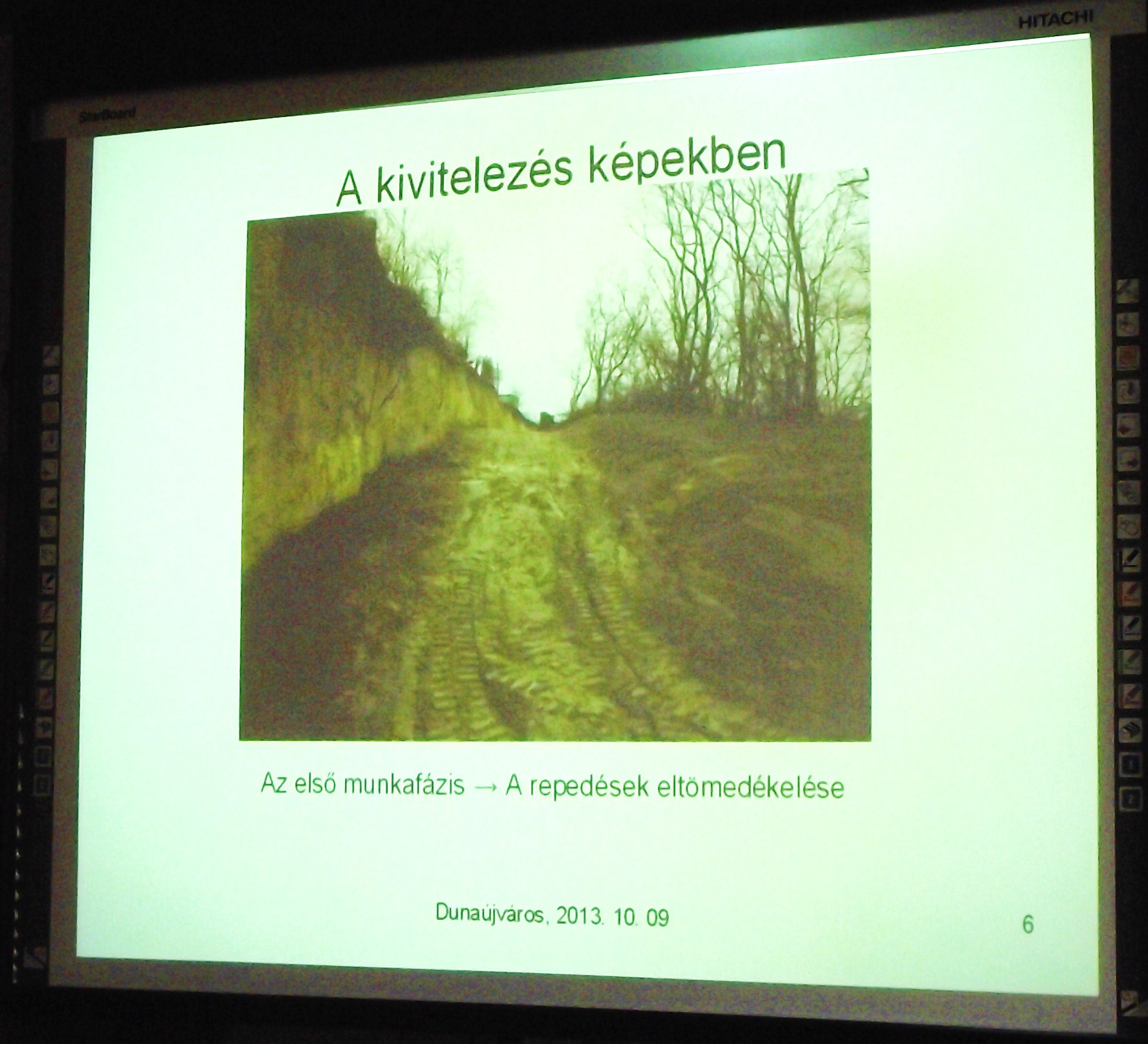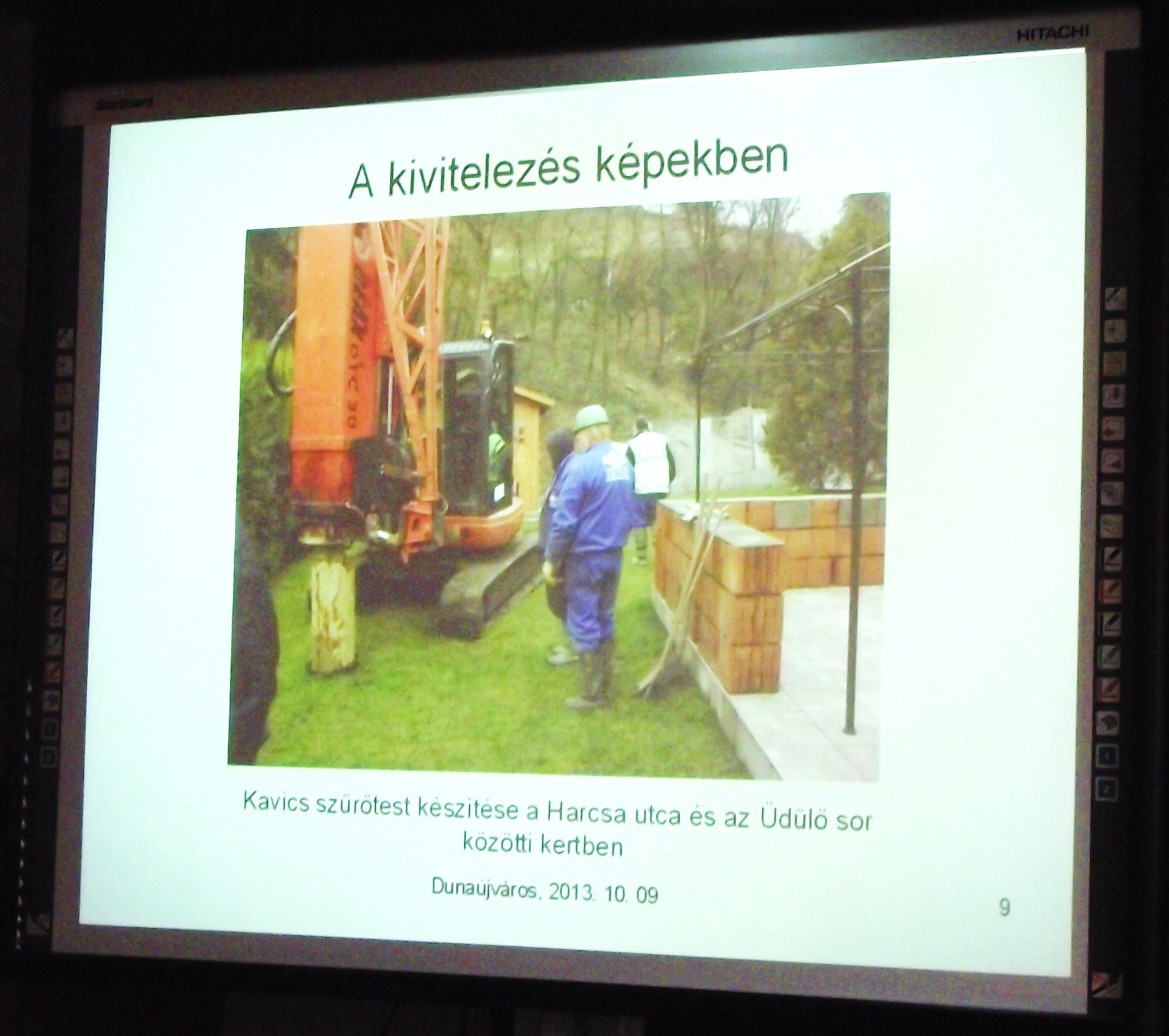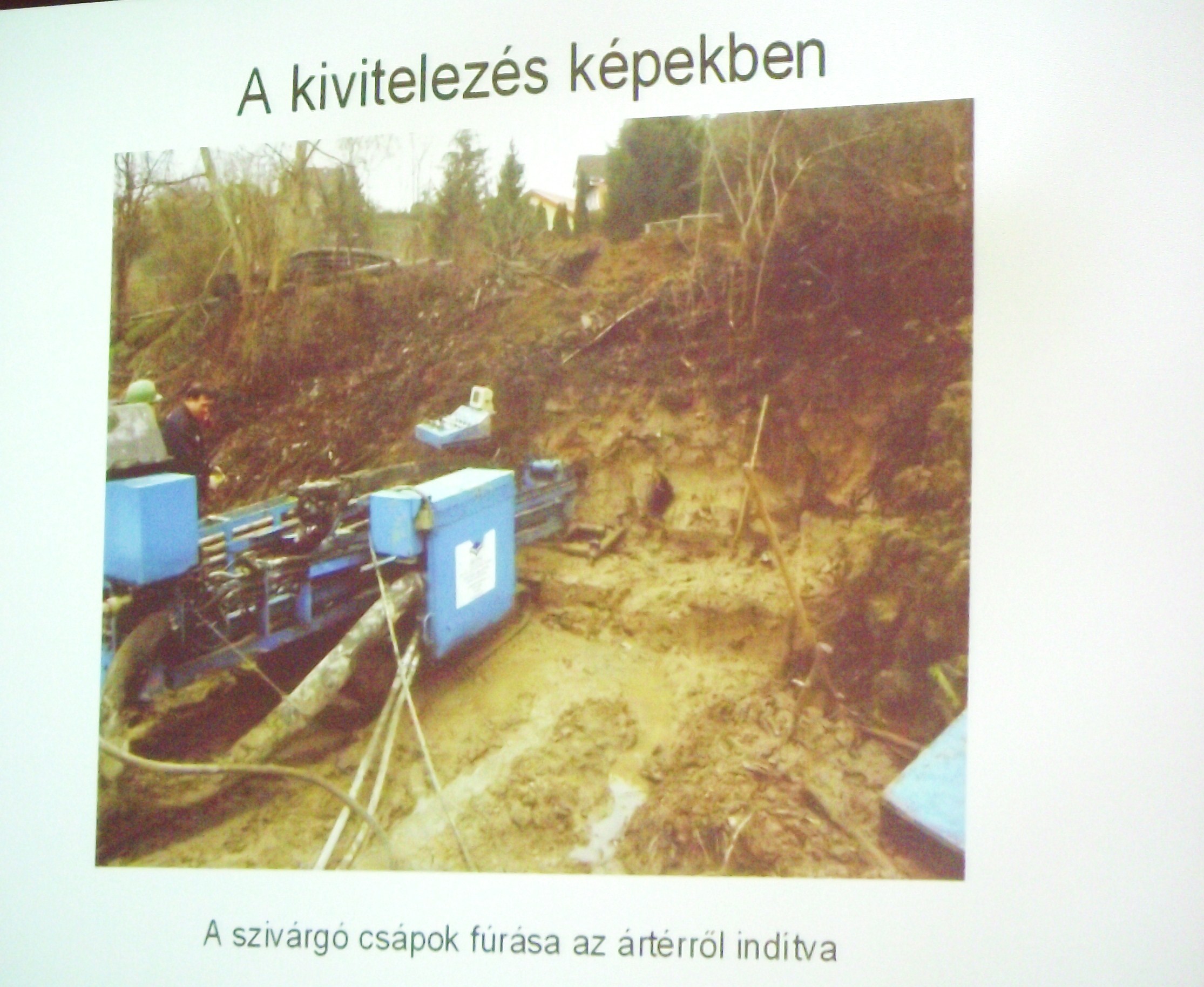 A kivitelezői munka tényszámai az alábbiak: Víztelenítő szűrőcsövek (dréncsövek) kiépítése (32 db); függőleges kavicsoszlopok (ejtőkutak) kiépítése (116 db); Harcsa utcai vápás vízelvezető kiépítése 183 méter hosszban; repedések betömése, partél tereprendezése mintegy 250 méter hosszúságban; az Ivó utca ideiglenes vízelvezetésének kiépítése; Monitoring kutak kialakítása (10 db figyelőkút); 24 db fix mérőpont elhelyezése; az Üdülő sor mintegy 266 méteres szakaszának helyreállítása. Szemesy István vetített képekkel is illusztrálta mondandóját. Közülük néhányat közreadunk.