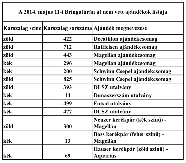 A 2014. május 11.-én vasárnap megrendezett Bringatúrán át nem vett tombolanyeremények - a karszalag felmutatásával - legkésőbb 2014. május 22.-ig átvehetők a Rudas Közgazdasági Szakközépiskola, Szakiskola és Kollégium titkárságán (2400 Dunaújváros, Római krt. 47-49.) munkanapokon 7:00 órától 15:00 óráig.
